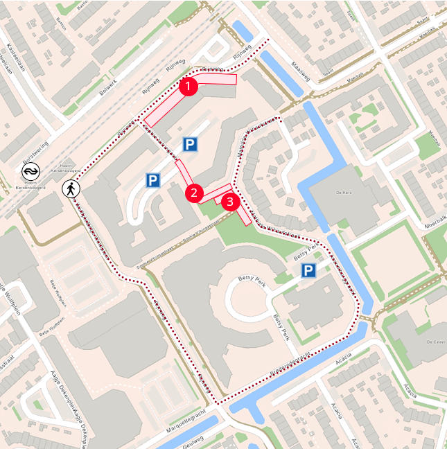 - Een deel van de stoep voor Rijnweg 5 t/m 38 wordt afgezet met hekken.